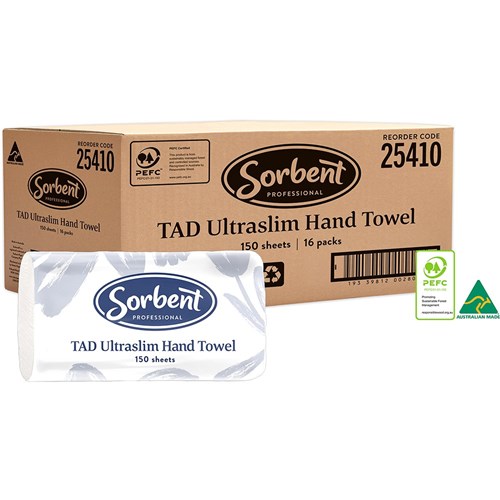 Advanced paper making technology (TAD - Through Air Dried) creates hand towels that are strong - wet or dry, softer and more absorbent, resulting in quick drying and enhanced user experience. Sorbent Professional TAD hand towels are ideal and cost-effective solution for high traffic washroom areas. Proudly wearing the official 'Made in Australia' logo, supporting Australian jobs and the local economy. 100% sustainable virgin fibre, which is independently certified annually by PEFC, ensures environmental responsibility. HACCP certification guarantees its safe use in food preparation areas. Compatible with Sorbent Professional 25506 dispenser (OC Code 2845950).
