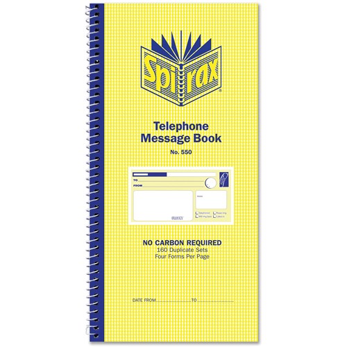 Spirax 550 phone Message Bk Carbonless 4 Per Pg 160 Duplicate Sets Side Opening