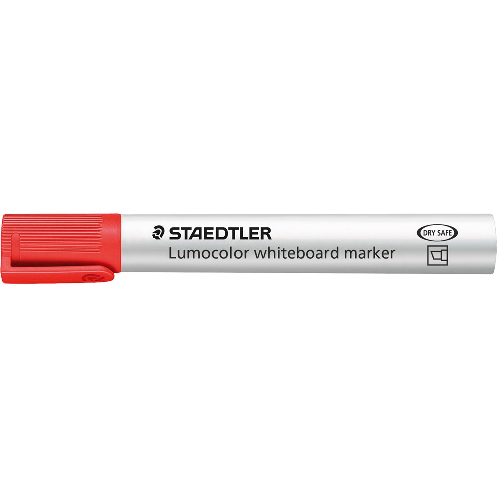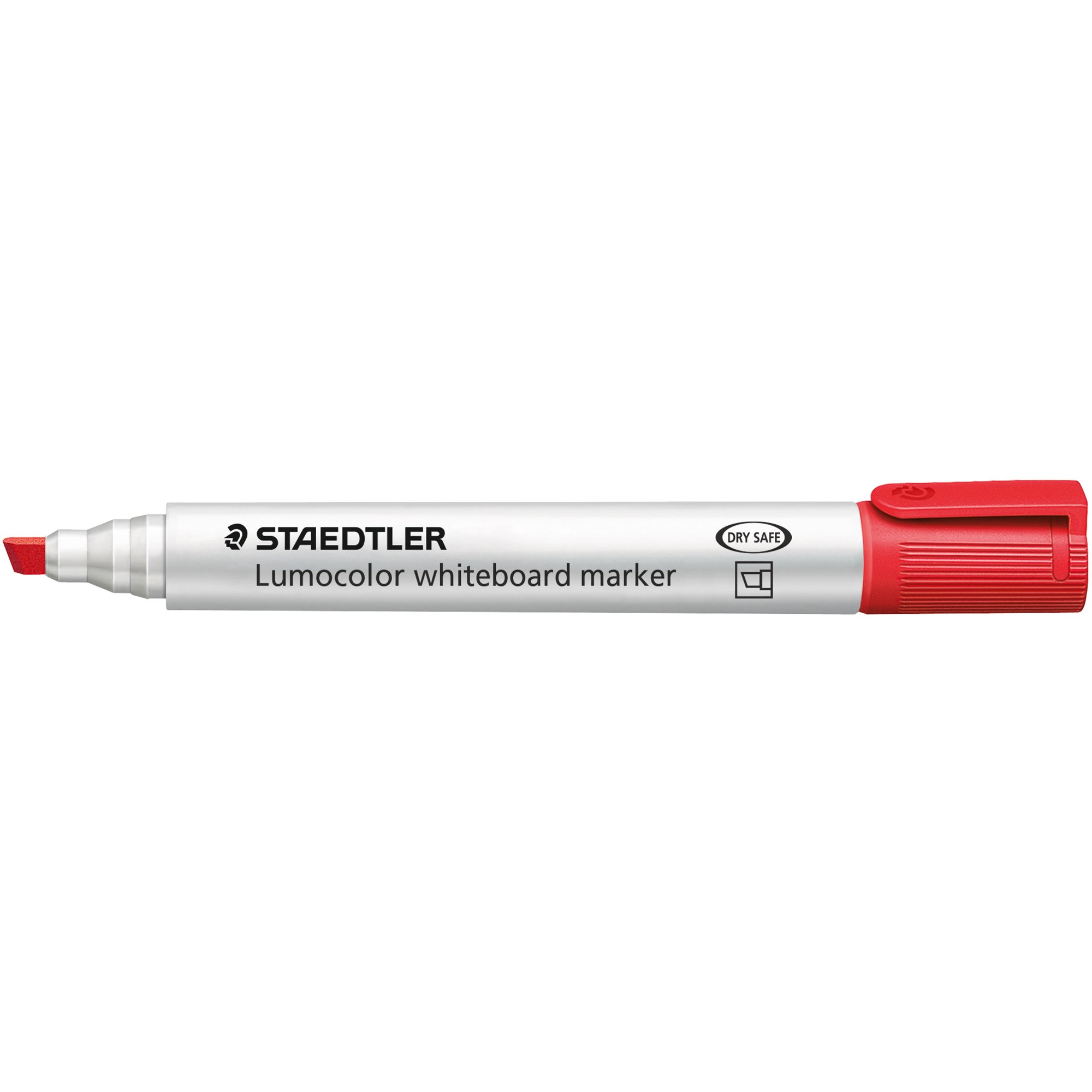 Red marker can be dry-wiped from whiteboards and surfaces such as glass and porcelain without leaving a trace Airplane-safe Fast drying, low odour and with convenient clip cap Dry safe Stand-up staedtler box converts to convenient desk set Xylene and toluene free ink Polypropylene barrel and cap guarantee long service life Chisel tip line width approximately 2 - 5mm