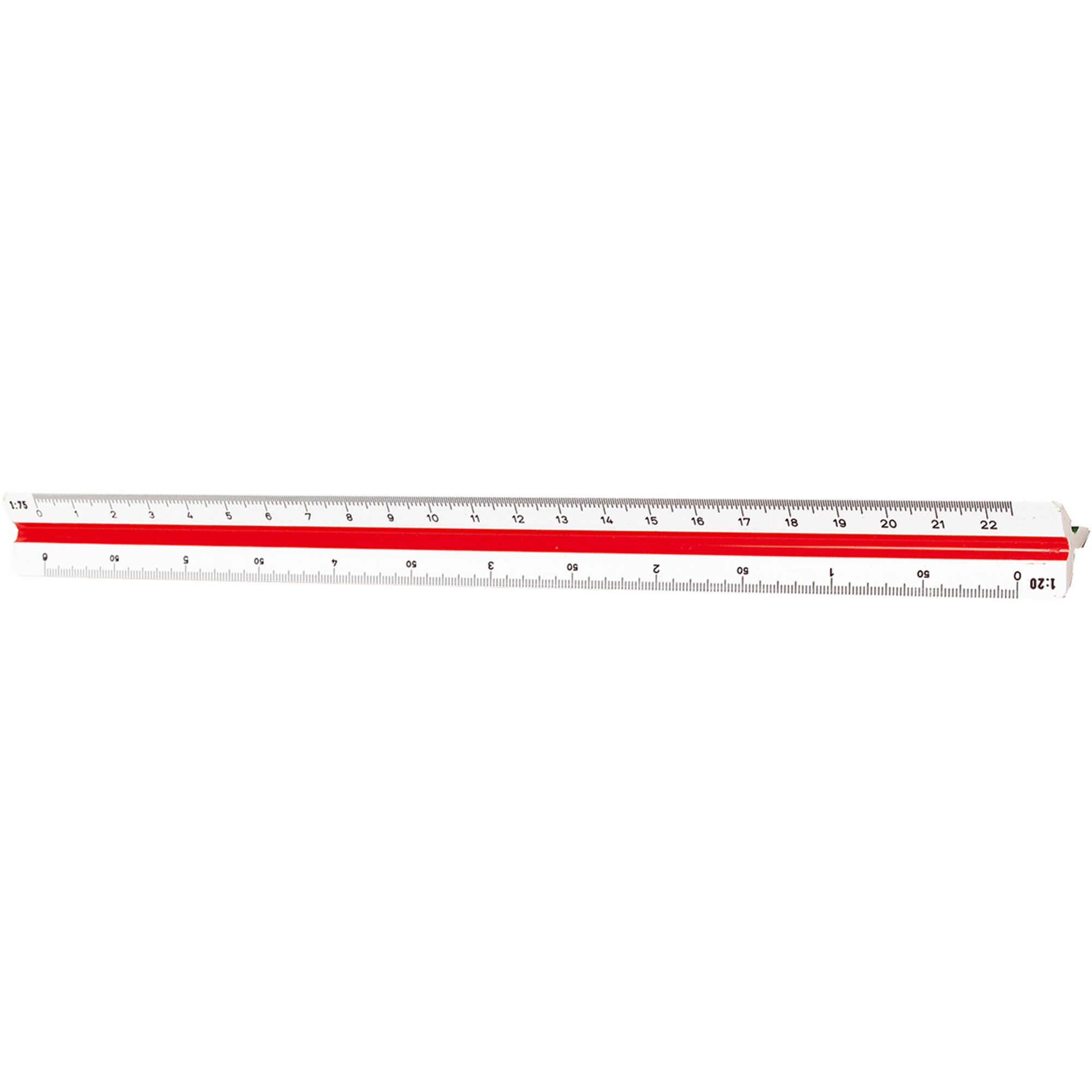Colour-coded grooves for easy identification of scales. 6 scales: 1:20, 1:25, 1:50, 1:75, 1:100, 1:125 Solid white plastic material.