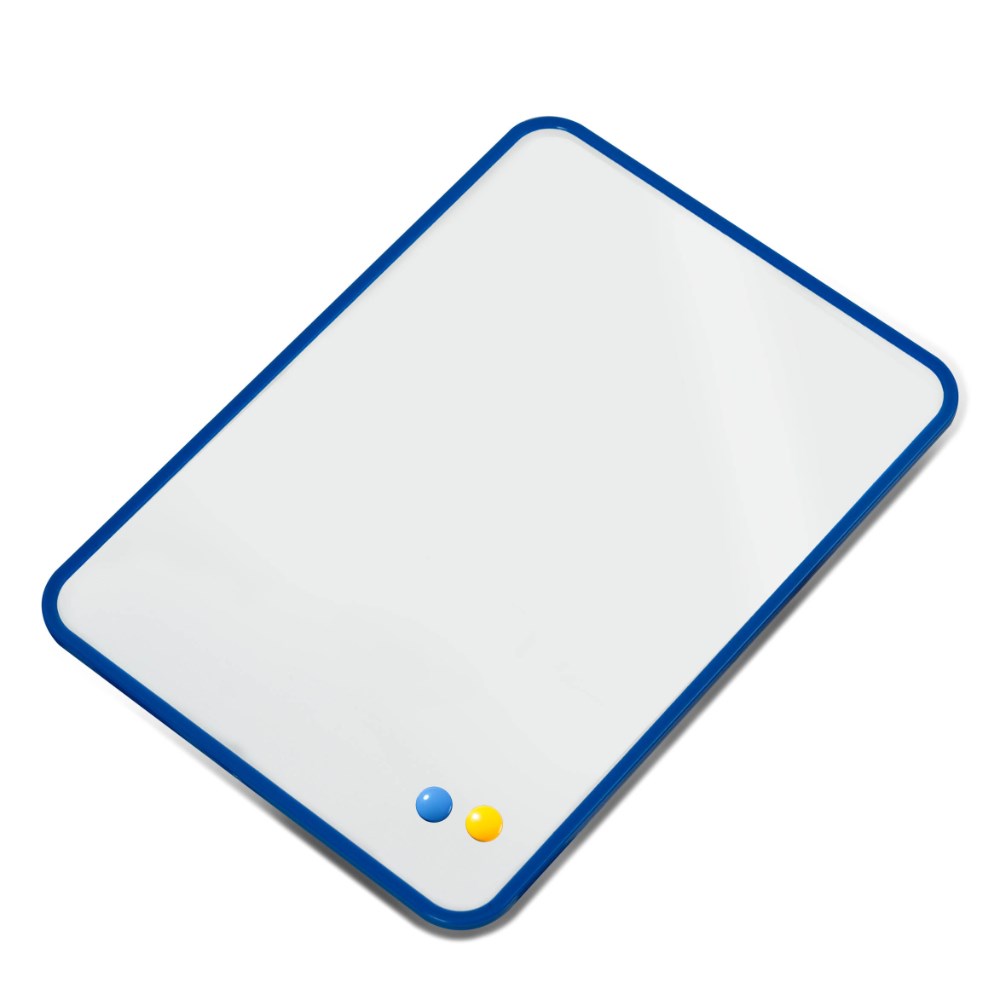 Double sided, Plain both sides. Lightweight magnetic whiteboards ideal for agile education. Great for collaborative group and individual focused learning. Add the optional Magnetic eraser/marker to make a complete individual student whiteboard solution, please see product 3039136. Size: 297W x 210mmH. Sturdy navy blue moulded frame. Save paper and allow students to practice skills. Use any whiteboard markers, wipes clean easily.