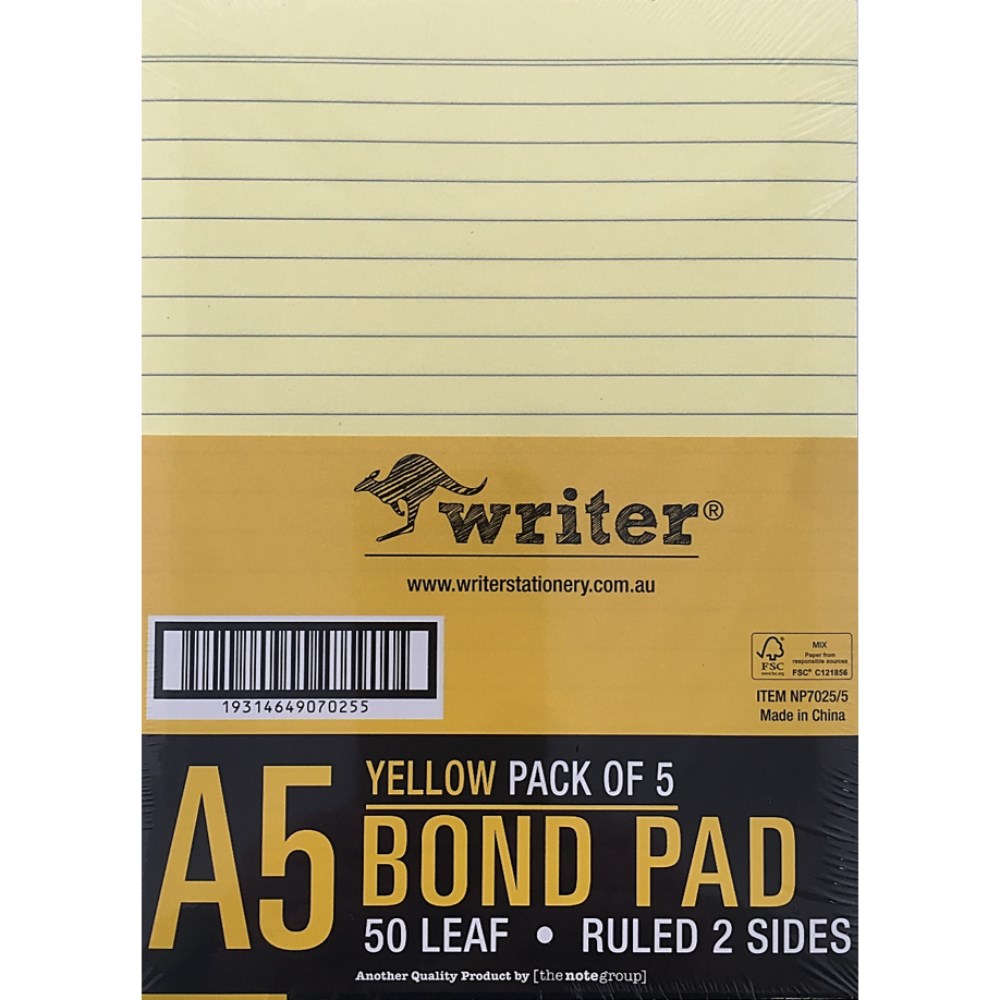 Writer A5 Premium Bond Pad 50 Sheet Ruled 2 Sides Yellow Pack Of 5