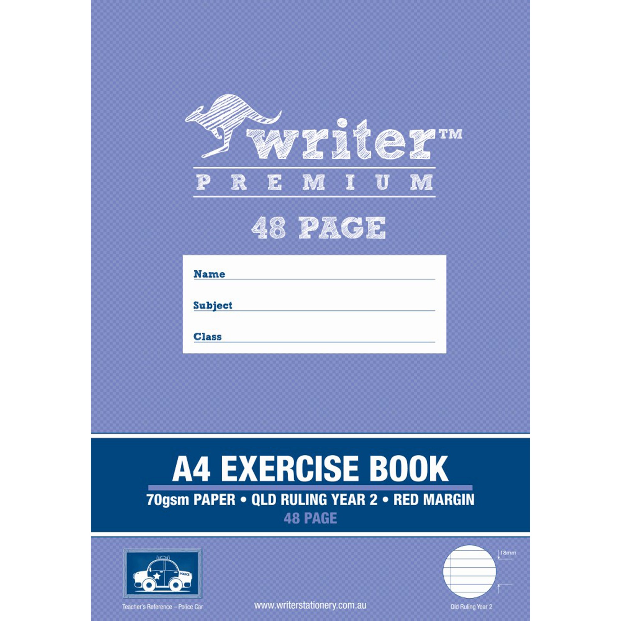 • Writer Premium Exercise Books feature heavy duty covers, high quality white 70gsm paper with blue & red Queensland ruled lines and a red margin