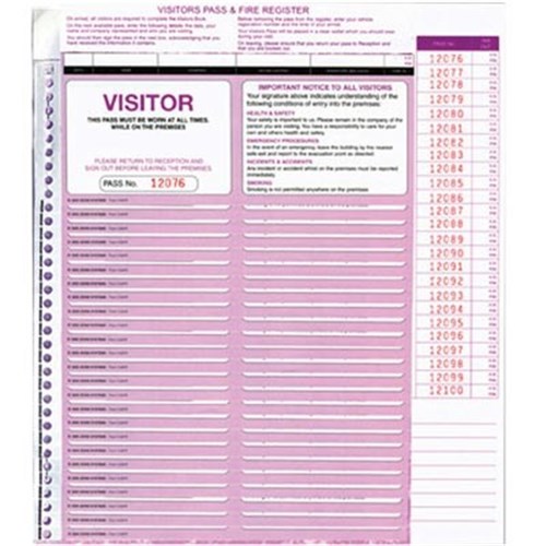Designed to comply with WH&S Regulations and the Privacy Act. Every visitor receives a personal visitors pass which is written out and issued. Because the register is in a security format, it means that no one can see who has signed in previously. T250 visitor pass slips with 25 to a view.