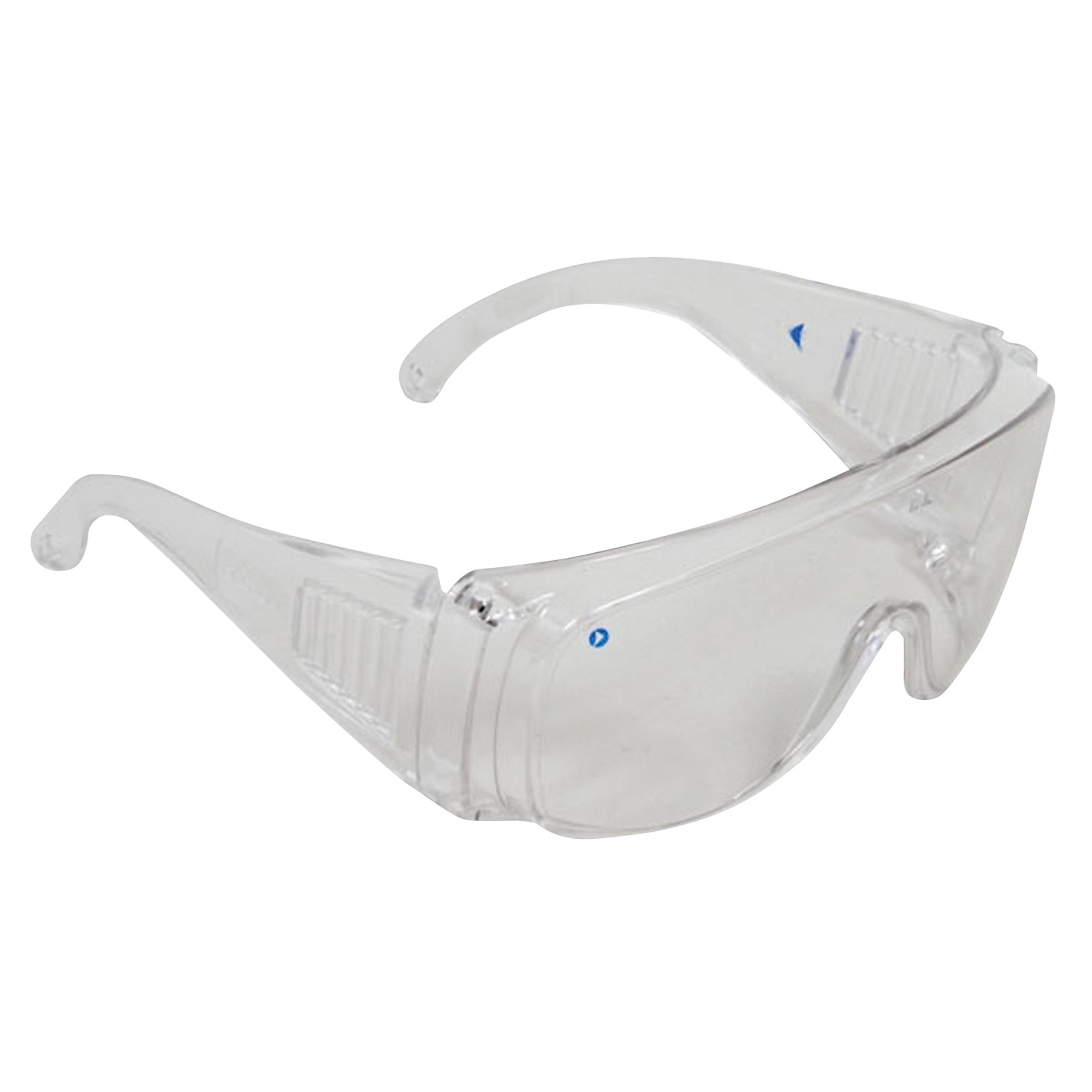 Medium impact. Deep design allows the glasses to be worn over prescription spectacles. 99.9% UV protection for outdoor wear. One piece lens provides unobstructed 180 degree view.